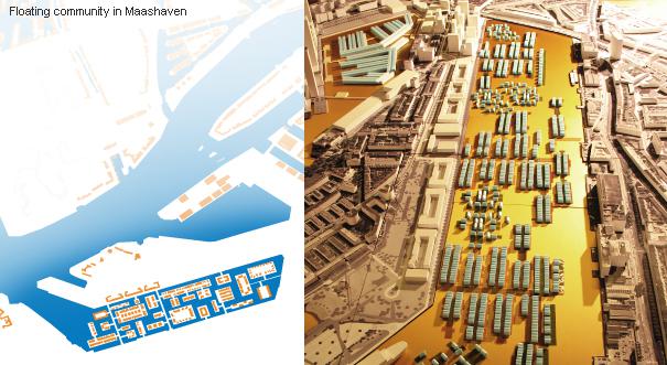 第一個(gè)角度,水平面上升的問題可以通過一個(gè)新的海洋防御方案得到解決。堤壩外圍區(qū)域采取的策略是承受周期性的洪水泛濫。第二個(gè)角度是把馬斯河指定為主要的公共區(qū)域,人們可以住在馬斯河沿線和上面。水的潮位變化是衡量建造濱河住宅區(qū)可能性的標(biāo)準(zhǔn)。第三個(gè)角度是不僅尋求一個(gè)更加廣泛的水上公共交通系統(tǒng),還有尋求一個(gè)更加平穩(wěn)的水網(wǎng)系統(tǒng)和陸地系統(tǒng)之間的互聯(lián)關(guān)系,建造出一個(gè)綜合性且有趣的公共交通系統(tǒng)。第四個(gè)角度提議把雨水排放從鹿特丹的排水系統(tǒng)中脫離出來。鹿特丹不會進(jìn)一步擴(kuò)建昂貴的地下水利基礎(chǔ)設(shè)施,而是讓雨水的保留、儲存和排放在公共空間上看得見且聽的見的。最后一個(gè)角度是強(qiáng)調(diào)突出馬斯河河岸多樣化的生態(tài)潛力。