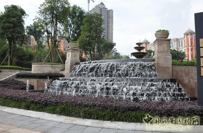 整體景觀以生態造園為設計理念,搭配精致細膩的歐式景觀元素,旨在營造出豪華高貴、優雅精致而又不乏地方特色的社區氛圍。整個景觀長卷由入口廣場氣勢恢宏的迎賓雕塑水景拉開序幕,奠定其高貴典雅的基調。園區內充分利用現有的地形高差變化,掘土為湖,堆土為山,打破單一的景觀視線通道,豐富了景觀軸線的縱深感;以幽靜舒適的林蔭步道將精致典雅的歐式景亭、靈性十足的疊水景觀、親切怡人的親水平臺等景點串連成一個有機整體,人游其中,步移景異。