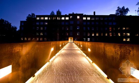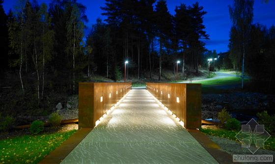 橋身包括隱藏在鋼欄桿下的兩個三角梁,橋全長32米。沿橋底的燈條加強了設計的簡約性和力度。考頓鋼加強了附近磚建筑的色彩和色調。灰色的混凝土橋面和照明帶的對比元素展現(xiàn)了一種紋理美,對視覺障礙者有很大幫助。預制橋面包括一個晶體正弦波,它象征著信息“水流”的流進流出以及河水的流動。橋的材料和造型和這里即將進行的新的建設的先驅。