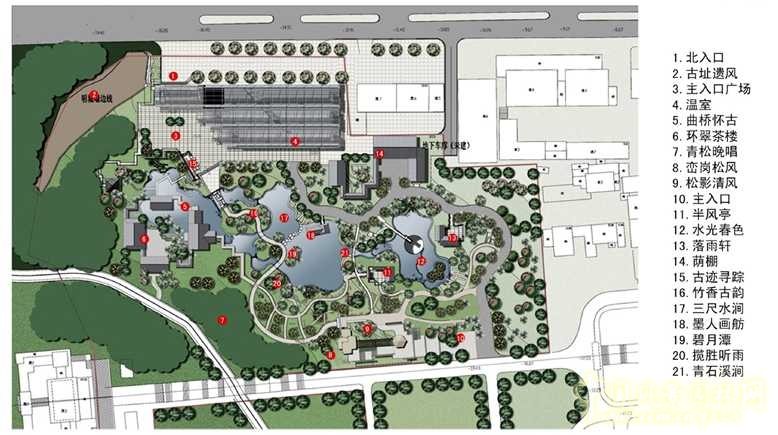 園內地形高程復雜多變,在設計中充分利用其地勢變化,因地制宜,將疊水、置石、盆景展示空間以及交通流線合理分布,并最大限度的保留了其內部的原有大樹。園內預留了充足的盆景擺放和展示空間,在游覽的沿途設置各種精致的景觀點,使游人在了解盆景文化的同時,又能體驗到步移景異的景觀效果。