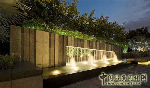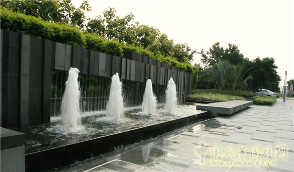 簡(jiǎn)潔、大氣,與建筑立面相呼應(yīng)的錯(cuò)層設(shè)計(jì)水景墻。