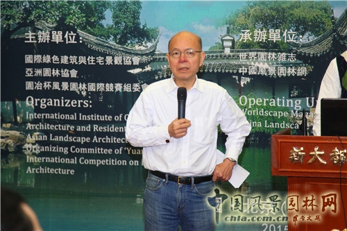 臺灣中國文化大學景觀系教授林開泰以《風景園林之蛻變與屹立不變的價值》為題,向在座的各位做了簡報。林開泰教授通過幾個簡單的例子講了變與不變之間的關系、蛻變與屹立不變的價值,并且對國外雨洪收集系統進行解說。