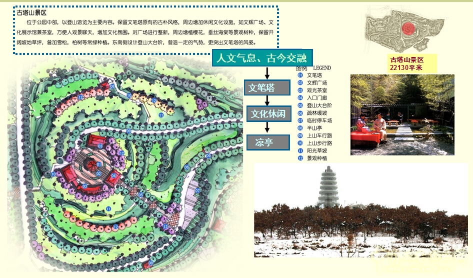 公園以自然山體為基底,園內東側結合文筆塔及景點的設置以人文休閑為主要功能;西側結合采石場改造以自然生態恢復為主。根據基地周邊環境,并結合園區現狀規劃將其分為古塔山景區、主題樂園區、健康休閑區、森林野趣區、果林幽香區、疏林草坪區,同時設有秋林愛晚、文筆晨暉、花階石瀑、翠塢聽音、蟬花竹語、松濤幽谷等若干景點。
