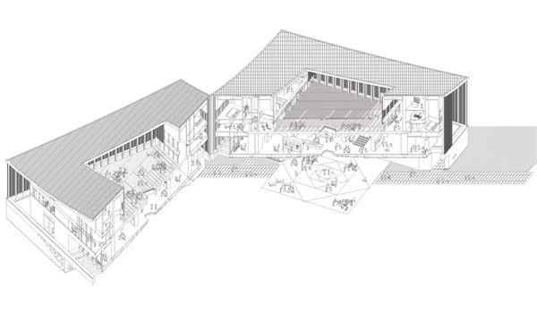 “關(guān)系院”首先表現(xiàn)在同時呈現(xiàn)的三種不同的院落形式:建筑底層的“井院”、建筑二層南北穿通的“水院”與“石院”、建筑三層四邊圍合的“合院”。并在此基礎(chǔ)上構(gòu)架起以井院、水院、石院、合院為主體的疊合的立體院落。“疊合院落“的初衷是期望在受限的場地上化解建筑的維度,將一個完整的大體量化解為三個更局部的小體量,這更便于我們以“身體”的概念對院落進行詮釋。我們得以從類網(wǎng)格的控制體系以及整合全局的習(xí)慣性秩序中脫身出來,從局部的略為松散的關(guān)系開始游覽。就像看似不相干的三種院子,由于各自的理由被聚集在一起,由于連接方式的不同而呈現(xiàn)出萬千風(fēng)情。