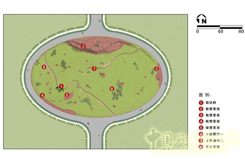 這張模型效果圖是從文化路北側(cè)過來看到的景象,由于這里本是一些裸露的山石,為了體現(xiàn)出迎賓的效果,設計師將它進行了擴大利設計,開鑿了長近120米,高4米,稍向內(nèi)側(cè)凹陷狀的自然山體石壁,來達到一種狹長的橫向感覺,以完成這條路上視覺焦點的空間表現(xiàn)。