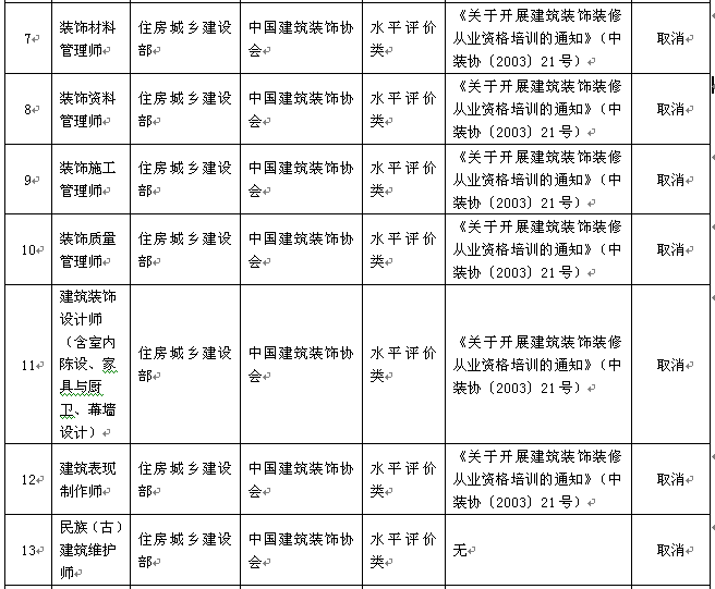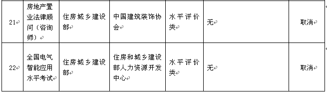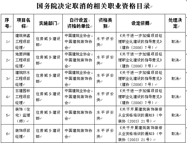 一、國務院決定取消的建筑保溫工程項目經理等22項職業資格(見附件),均為我部有關直屬單位、部管社團自行設置的、沒有法律法規依據的水平評價類職業資格。各相關單位要立即停止開展與這些職業資格相關的評價、認定、發證等工作,也不得以這些職業資格的名義開展培訓活動,或以其他方式變相開展與這些職業資格相關的活動。