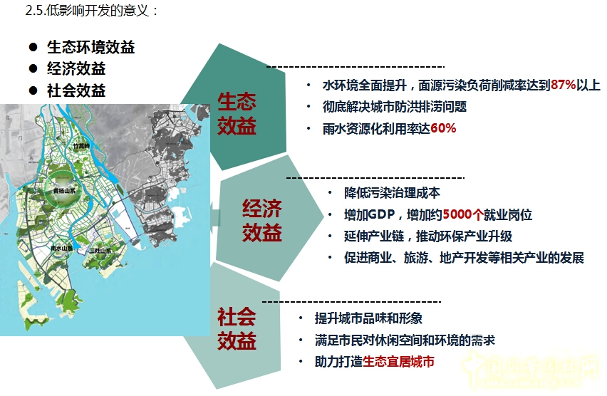 低影響開發最根本的條件是什么?第一,尊重水資源和水質;第二,尊重植被;第三,尊重表土;第四,尊重地形地勢。當然到最后來說它還是要實現生態效益、經濟效益、社會效益。