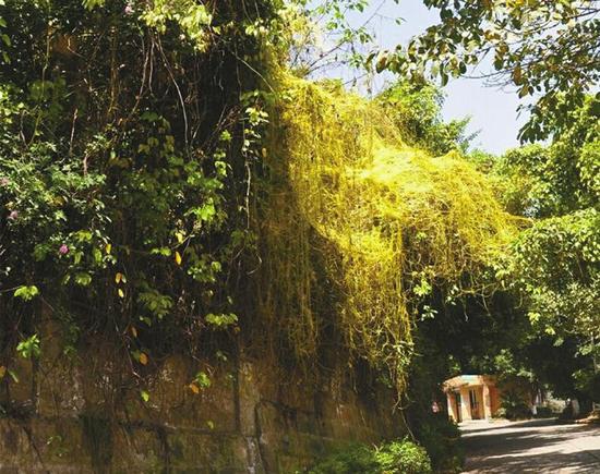 近日,在順慶區舞鳳山下山通道的道路一側,細心的市民會發現,一些原本長勢較好的樹木被一種黃色的植物纏繞、覆蓋,有的樹木已死亡。記者在現場看到,在靠近山體一側的樹木樹冠上掛滿了黃色的藤蔓,就像被噴上了黃色的彩條,其中較矮的灌木叢更是像被一張黃色的大網覆蓋。
