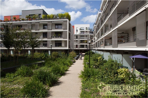 從以上這些圖中我們可以看到一個組團是怎么組合的,這些組團都不是封閉的,全部都是開敞的,可以通過組團中間的路很便捷地到達周邊的步行道或者去周邊商店買東西。剛才說到每個城市組團都是由不同的建筑師來做的,所以需要一個東西來協調,我們就制定了一個景觀手冊來指導設計師做設計,尋找出一個共同性。隨著城鎮化的發展,居民隱私的保護越來越重要,所以在設計里面設計師很注重這一點,通過植物帶的隔離保證居民的隱私,同時又創造出了便捷的道路來穿過組團。