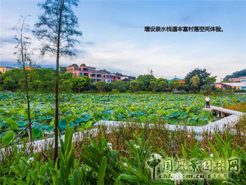 這是池塘修建后的景觀,原來臨水的平臺是沒有的,而是一圈池欄,我們將欄桿去掉,將空間打開,在新增加的水面上,設置了棧道等親水平臺,伸入水中,解決了原本水位比較低、荷花跟人距離很遠的問題,讓人身處于其中能與自然充分親近。