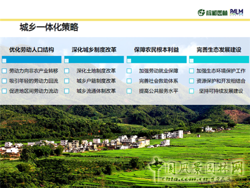 第二點,城鄉一體化的策略制定方面。優化勞動人口結構,深化城鎮制度改革,保障農村根本利益,完善生態發展建設是四大基本方針。保障農民根本利益這一點,我們不是簡單的停留在口頭上,而是落實到土地的流轉、農民未來產業的發展、再就業等實際行動上,希望能夠實現就地城鎮化。城鄉基本公共服務設施保證均等化,讓農民享受城鄉一體化的生活,農民享受城鄉一體化的權益,農民享受城鄉一體化的精神文明。