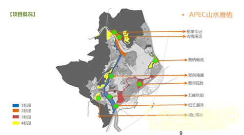 下面,我交流的項目是去年在APEC國際會議中心的景觀項目,是用傳承創新和生態人文理念進行的項目實踐。示范區規劃范圍東起懷豐公路,西至懷柔區雁棲鎮鎮界及下辛莊、柏崖廠村界,北起雁棲鎮柏崖廠村界及中科院用地北邊界,南至京通鐵路。規劃總用地2097.97公頃,其中林地990.21公頃、公共綠地及防護用地543.52公頃、水域249.69公頃、可開發建設用地280.66公頃、道路廣場用地33.89公頃。公共景觀綠化工程項目涉及用地面積共計1533.73公頃。共栽植喬木12萬株,其中山體綠化10萬株,土方108萬方。