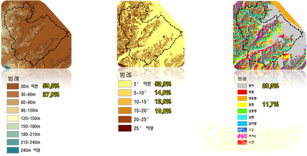 下面我們來看一下水循環(huán)的情況。上圖分別是江陵市的地形構(gòu)造圖、土地覆蓋及不透水鋪裝的現(xiàn)狀圖,這里有一個叫南大川的一個區(qū)域,在這周邊我們要集中建設(shè)一個屋頂綠地。在研究了現(xiàn)有植被類型及居住結(jié)構(gòu)之后,我們發(fā)現(xiàn)在以山嶺低洼地區(qū)為中心的溝地,植被和景觀破壞非常嚴重,所以我們希望促進松樹和其下層的植物的生長,修復(fù)山林和周邊的地區(qū),恢復(fù)物種的多樣性。