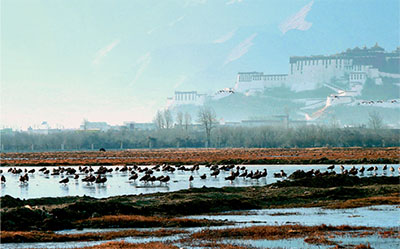 拉薩河引進(jìn)的水源經(jīng)流沙河、北干渠、中干渠和南干渠構(gòu)成的“三渠一河”常年累月澆灌著濕地,滋養(yǎng)著濕地的魚類和水鳥。而水源經(jīng)過沉沙池處理后,再變成一汪清水流回拉薩河,從而形成一個(gè)完整的水流循環(huán)系統(tǒng)。在靠近哲蚌寺的濕地西側(cè),水草連天,與遠(yuǎn)處的布達(dá)拉宮構(gòu)成一幅恬靜的水墨畫。