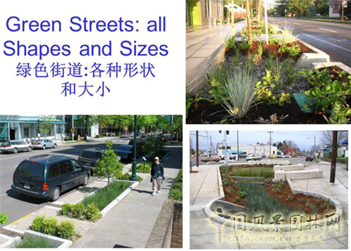場(chǎng)地綠化雨水收集系統(tǒng)、設(shè)置綠色設(shè)施、建造綠色街道等,這些方法能夠吸收85%的污染。綠地大量出現(xiàn)在城市道路路面的設(shè)施中,融入路面,就好象沒(méi)有經(jīng)過(guò)設(shè)計(jì)的小場(chǎng)地。