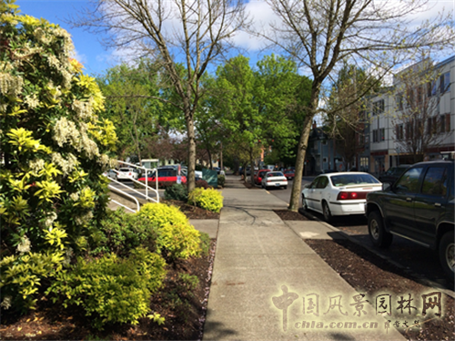 生態措施讓城市環境處于一個自然原始的狀態。市政府的大樓設置生態屋頂;路邊設置徑流植物區,利用植物和土壤來減緩,過濾和滲透雨水徑流及減少高峰雨水流量,同時改善雨水徑流水質;建筑的周邊通過雨水收集進行灌溉,引導雨水下滲。停車場、居民區等改造,采用大量的鄉土種類的植物配植,減少人工養護,處于一個非常原始的狀態。