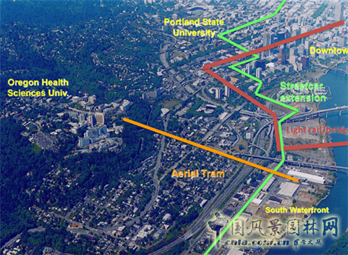 在濱水區改造過程中,我們做了很多方案,目前因為資金的問題實施的非常緩慢,但是在一些很重要的節點規劃上,除了汽車的交通工具以外,大量利用纜車、高空纜車,來連接山里的大學和山下輕軌中轉站的交通,減少對山體交通的壓力。