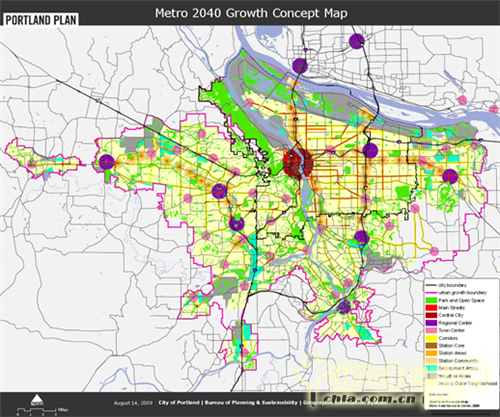 在建造宜居城市,還有達到生態目標的時候,我要給大家分享最重要的一點,波特蘭的城市規劃與增長控制。在美國規劃的層面里,州是一個非常獨立的實體,在州這個層面共有19個規劃目標,把規劃目標整理以后,我們發現對于資源保護這塊,內容是比較多的。在他們州層面的規劃當中,公眾參與和土地規劃的法定程序和管理模式是列為第一位的。在規劃當中,首先明確規劃的公眾參與途徑,用法定的程序來進行認定,其次才是進行具體的規劃和目標設定。由此,也可以看出他們非常重視資源保護這類,包括自然資源、城鎮化、人員等諸多方面內容。