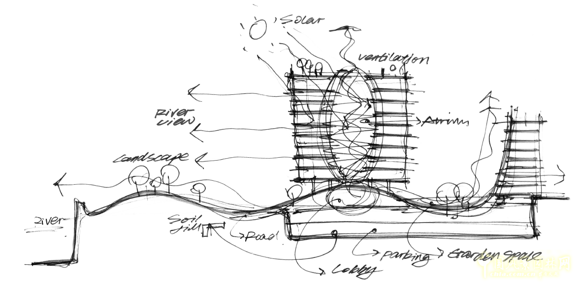 我當(dāng)時(shí)畫了這樣一張草圖,將開放空間面向黃浦江的濱江地帶,希望能夠把我設(shè)計(jì)的景觀和城市做一個(gè)很好的銜接。