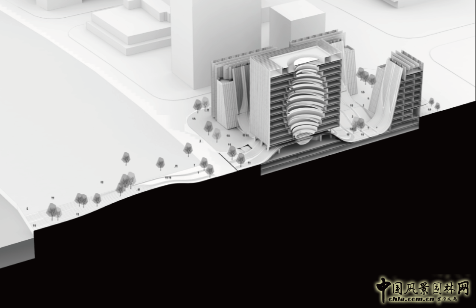 在這個(gè)項(xiàng)目中我拋棄了之前在技術(shù)上的所有想法,重新回到了一個(gè)很原始的城市設(shè)計(jì)的概念中。我認(rèn)為辦公區(qū)不應(yīng)該是一個(gè)封閉的盒子,它應(yīng)該是開放的。所以就運(yùn)用與當(dāng)年天津項(xiàng)目很相似的做法,通過削減,將整個(gè)建筑體量打開,希望能夠把景觀裁選出來。總部的基地是一個(gè)漂浮在空中的,通光效果很好的室內(nèi)環(huán)境。我們在建設(shè)中放棄了很多炫麗奢華的材料,將建筑的空間跟體量、包括材料、立面做的很精致,從而做到真正的節(jié)能。