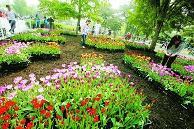 昨天,由五種顏色萬余株郁金香組成的百米花毯在北京植物園展出,這是國內首例郁金香花毯。