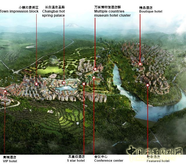 這是我們做的一個東北的小鎮項目,位于長白山自然風景區內,大家看平面和鳥瞰圖,從專業的角度講,會發現做過了,因為這個所謂的小鎮,里面附著的概念和板塊過多,酒店、會議、精品、小鎮印象、溫泉等基本都包括在內。并且我們會發現,設計圖和最終的規劃圖紙的區域不相符。我們國家的規劃體系,決定了規劃局在確定用地的時候,基本是采取一刀切的做法,所以很容易和之前的規劃、包括城市設計的用地都有所出入。