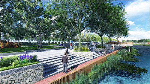 不僅是結合文化,在設計濱水景觀與道路景觀的同時,設計者把全新的“海綿城市”的設計理念也貫穿在其中,道路中的“雨水花園”,“生態滯留池”,護坡生態墻等生態領域的運用,讓城市建設的同時也是在保護著我們的自己的家園。雨水回收運用技術與東南大學進行了技術交流和探討,在局部還做了試驗段,為將來城市發展做了很多研究性的科研。