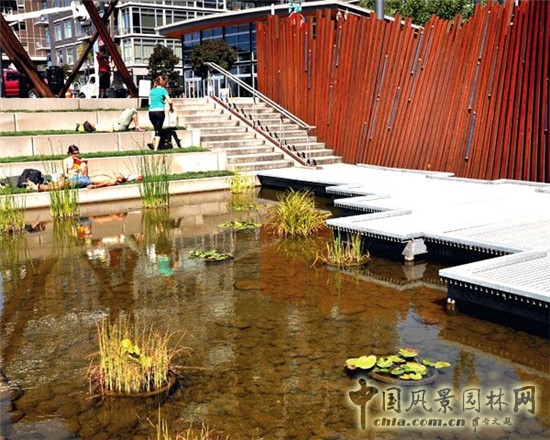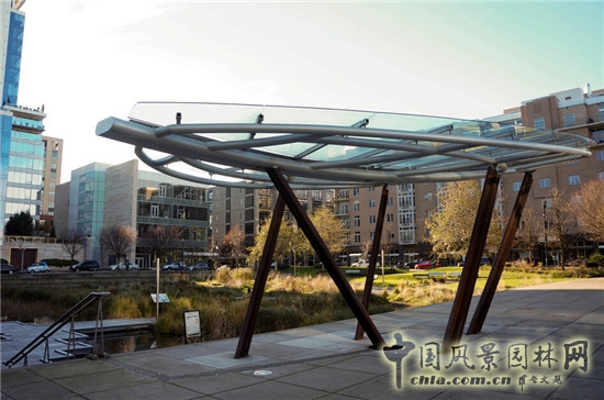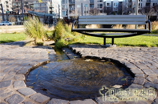 公園設計充分利用了基地地形從南到北逐漸降低的特點,收集來自周邊街道和鋪地的雨水。收集雨水的亭子位于街道上成為唐納德溪水公園創新性最大的亮點。亭子被建成葉子的形狀,收集到的雨水在這里經過處理后,重新以溪水和噴泉的形式進入公園。