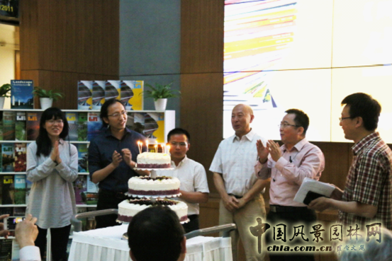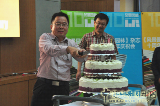 在社長何昉和主編王向榮的帶領下,雜志社代表一同走到前臺,在場嘉賓同唱生日歌,祝?!讹L景園林》雜志十周年生日快樂。何昉社長親自切蛋糕,與來賓分享《風景園林》十周年的喜悅,并開啟了當晚的冷餐會環(huán)節(jié)。與會嘉賓在輕松愉快的氛圍中相互交流,分享與《風景園林》雜志的點滴故事。