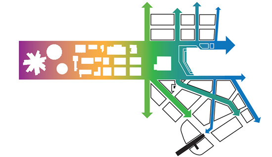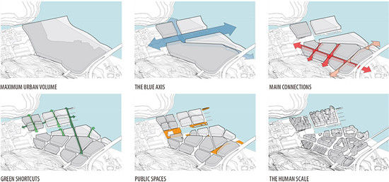 在整個設計方案中,三個不同的區域相互結合,創造了多變的城市空間,以及多樣化的建筑單元和形式。整個規劃區域通過一個完整的自行車交通系統緊密結合起來,提供了清晰且通暢的自行車道規劃,充足的自行車停車空間,使自行車出行成為最簡單和有效的交通方式。同時,規劃為該區域創造了靈活多變的開發區域,使各個區域根據城市密度的具體需求而變化,同時保留了貫通整個海港區的豐富的城市街道生活空間。