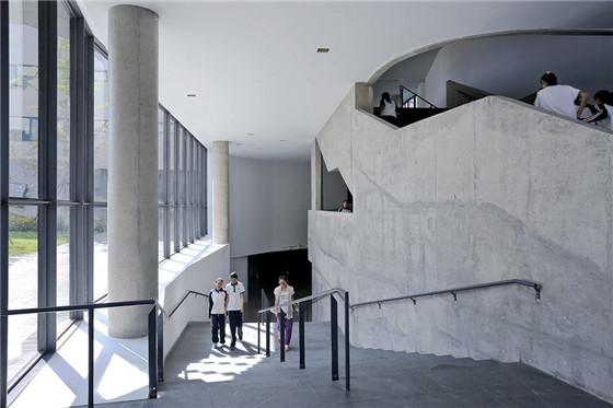 新校區的主體建筑是一個呈根莖狀的空間組織結構,所有的教室與實驗室等常規教學空間均被架空于地面以上,構成了高效聯接的上部建筑教學空間,連結教室的主要交通流線進一步拓展成為教室外部的社交空間,另有一些自由形態的半私密式圍合空間,主要服務于一些小型的社群活動。