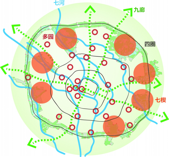 指繞城高速路以內依托錦江、沙河、江安河、清水河、摸底河、東風渠、毗河等七條支流水系形成綠化生態廊道,主要由水域和兩側綠地共同形成。