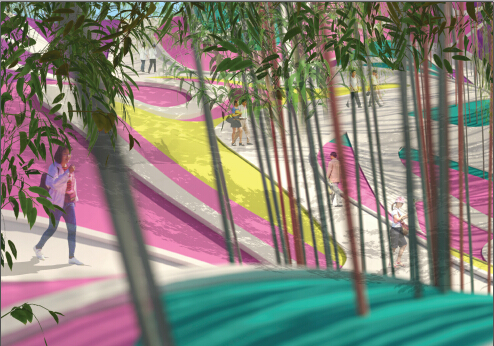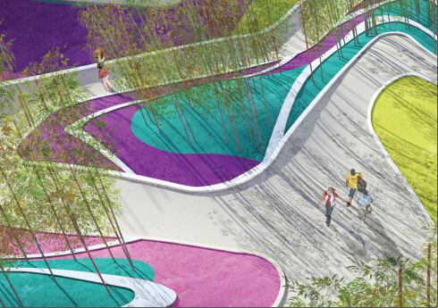 這些飄帶充滿詩意的勾勒出了場地的空間和輪廓,同時允許富有冒險精神的游客在其上游玩,與這些花園路徑融為一體。色彩豐富的植被中不時穿插種植了枝葉繁茂的微型竹林,一同編織出花園內部的美麗圖案。