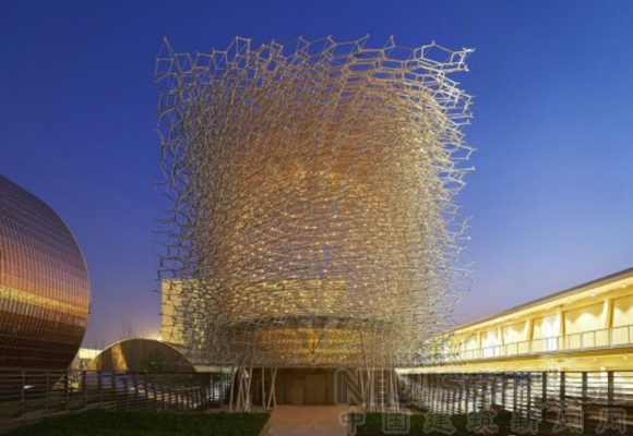 2015世博會英國國家館由諾丁漢的藝術家Wolfgang Buttress與其帶領的建筑師和設計師團隊設計完成。巨大的鍍金鋼質球體虛擬了蜂巢,半透明的、幾何狀的布局是在蜂巢固有特點上的再創(chuàng)造。該設計旨在強調蜜蜂對于生態(tài)系統(tǒng)的重要性,而蜜蜂這一主題也與米蘭這座城市相互呼應,因為米蘭的守護神安波羅修正是養(yǎng)蜂人的守護者。