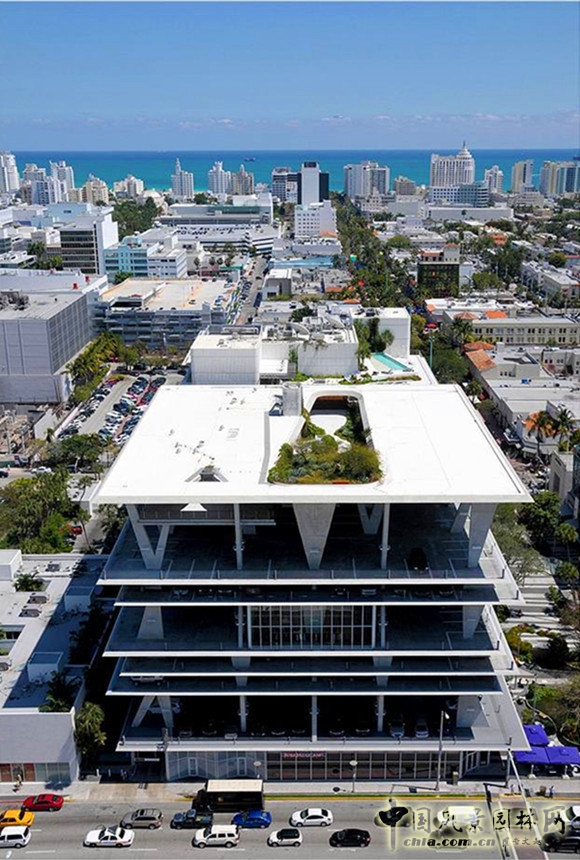 對這個位于林肯大道盡頭的榮獲建筑大獎的停車場而言,空中花園的設計堪稱點睛之筆。整棟建筑簡約而大氣,是邁阿密海灘的地標之一。建筑師將住宅懸置于建筑的頂板之下,同時將其切割成不同的空間。在這座高達75英尺(約23米)的停車場中,空中花園的設計是對空間的最大化利用。盡管該處景觀設計頗顯獨特,卻因其含蓄的空間位置而避免了過分的張揚,這反倒使景觀真正突顯了其本體感。