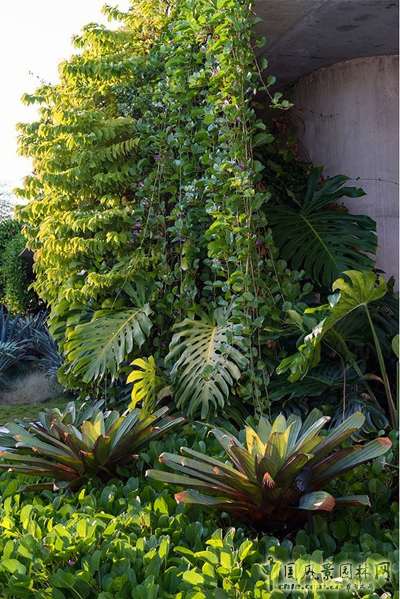 空中花園中茂密的藤蔓將私人電梯巧妙地掩映其中。素有“瑞士奶酪”之稱的龜背竹和帝王鳳梨樹使得景觀的文理更加多樣、色彩更加鮮明。