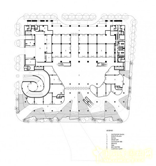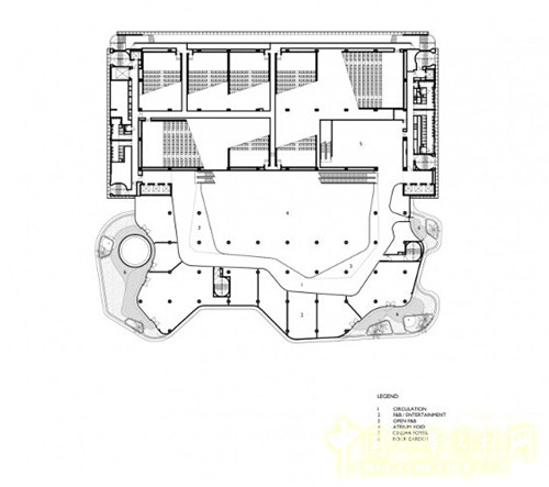 內部中央空間分為三個主要部分來設計,第一層的空間與周邊街道形成路網,方便行人進入。第二層的空間與人行天橋相連,跨越道路,在綜合體與附近的建筑之間建立通道。負責來分開空間的是一個城市廣場,高出街道20米,設置餐廳、酒吧、電影院等。第三主要空間是屋頂劇場和娛樂活動區域,蔥郁的植被覆蓋露天平臺,屋頂中央有一個玻璃天窗,通過天窗可以看到中庭,在中庭里有可以看到植被的屋頂,使空間顯得更為開敞。