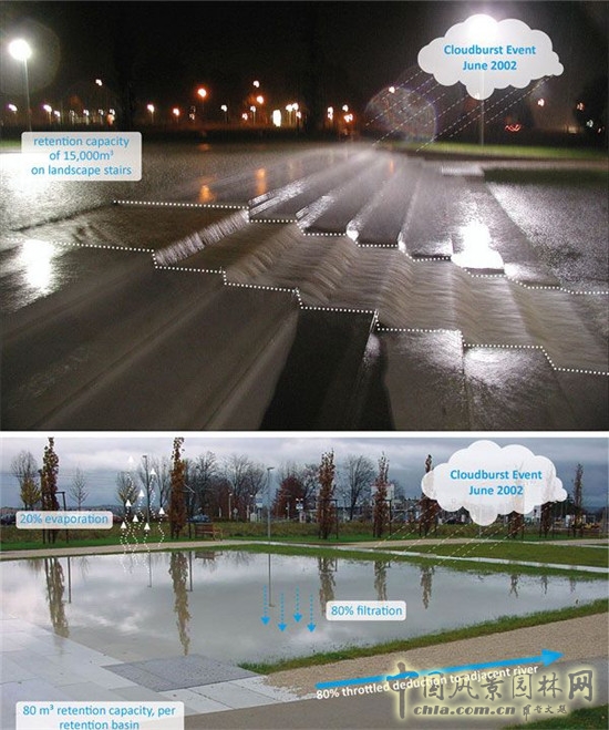 他們尋求適當的方式來排水和收集雨水。通過渠道和洼地排水;通過腐殖質、砂和火山巖層留住雨水。水向下穿過階梯式的公園,形成奇異的效果。所有的建筑上都設計了屋頂綠化,從而留住更多的雨水。雨水如果有溢出,也可流到延遲盆中得到短暫的儲存。