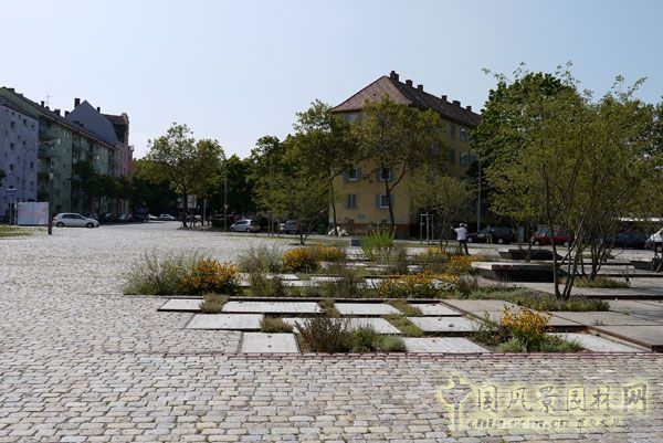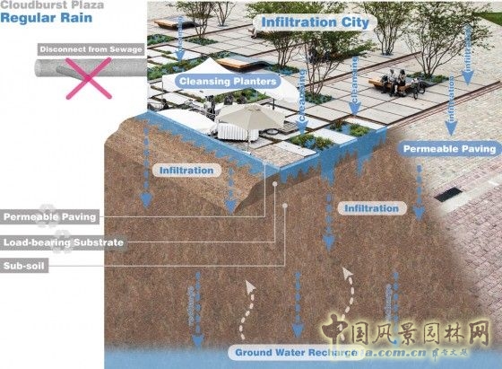 正方形的廣場具有良好的排水功能,常規的雨水成為主要的儲存來源,美麗的種植池成為主要的滲透點。地下的砂石壕溝和改革的內置過濾介質減少了下水道系統的液壓超載,縮進的廣場區域創建了一個地表防洪區,使土地表面的水完全滲透到地下,沒有一滴流入下水道系統中。