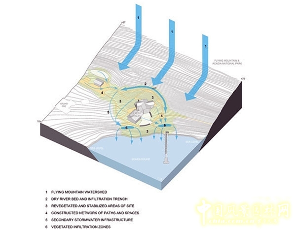 該項(xiàng)目的改造對(duì)于設(shè)計(jì)師而言存在著眾多的挑戰(zhàn)。項(xiàng)目距離桑德峽灣不足23米,一系列的州級(jí)、聯(lián)邦級(jí)條款也約束著項(xiàng)目的進(jìn)行。經(jīng)過(guò)景觀設(shè)計(jì)師對(duì)場(chǎng)地的精細(xì)考察之后,項(xiàng)目列出了四點(diǎn)目標(biāo):