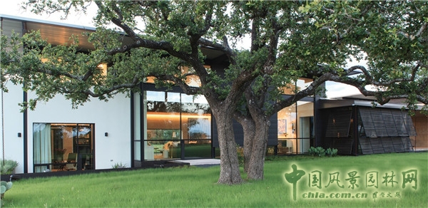 西南方向的住宅主建筑,其設計充分呼應了壯觀的天然槲樹景觀。