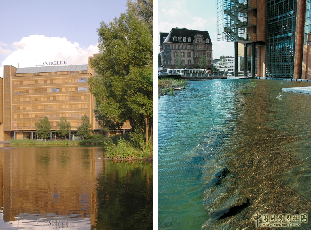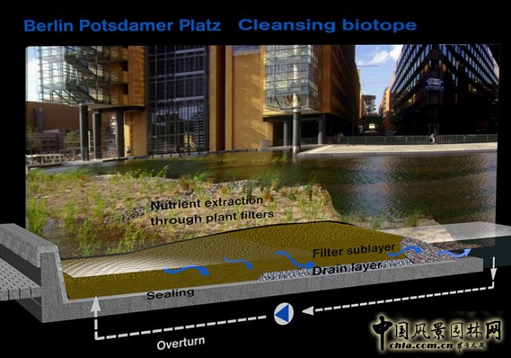 廣場內有五個大型地下蓄水池,在降雨過多的季節內,多余的雨水通過人行道的街道,慢慢的流入到蓄水池中。在流入到蓄水池的途中,會經過街道和人行道旁的植被群落,雨水通過生物過濾床被凈化,過濾后的水成為高質量的水,含有豐富的氮,磷,氨,氮,亞硝酸鹽等,非常適合水生植物的生長。