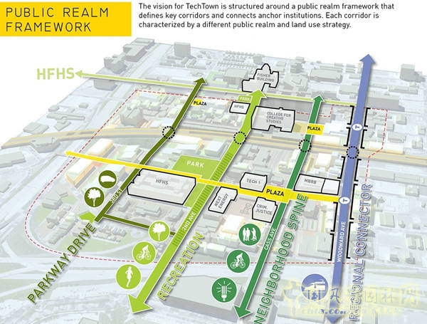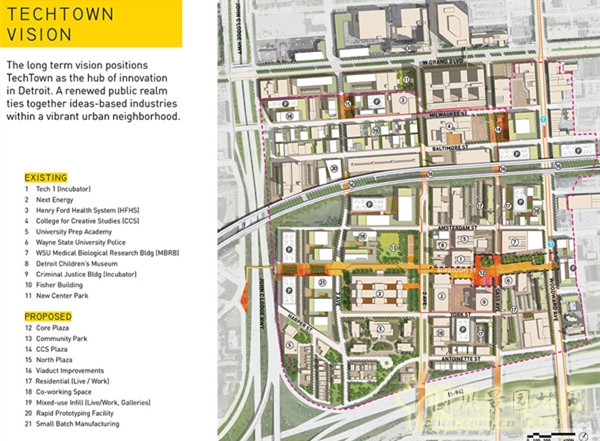 科技城的遠景:科技城在未來的定位是底特律市創新研發中心。經過改造的公共領域將促進創意企業在充滿活力的城市社區中的滲透。