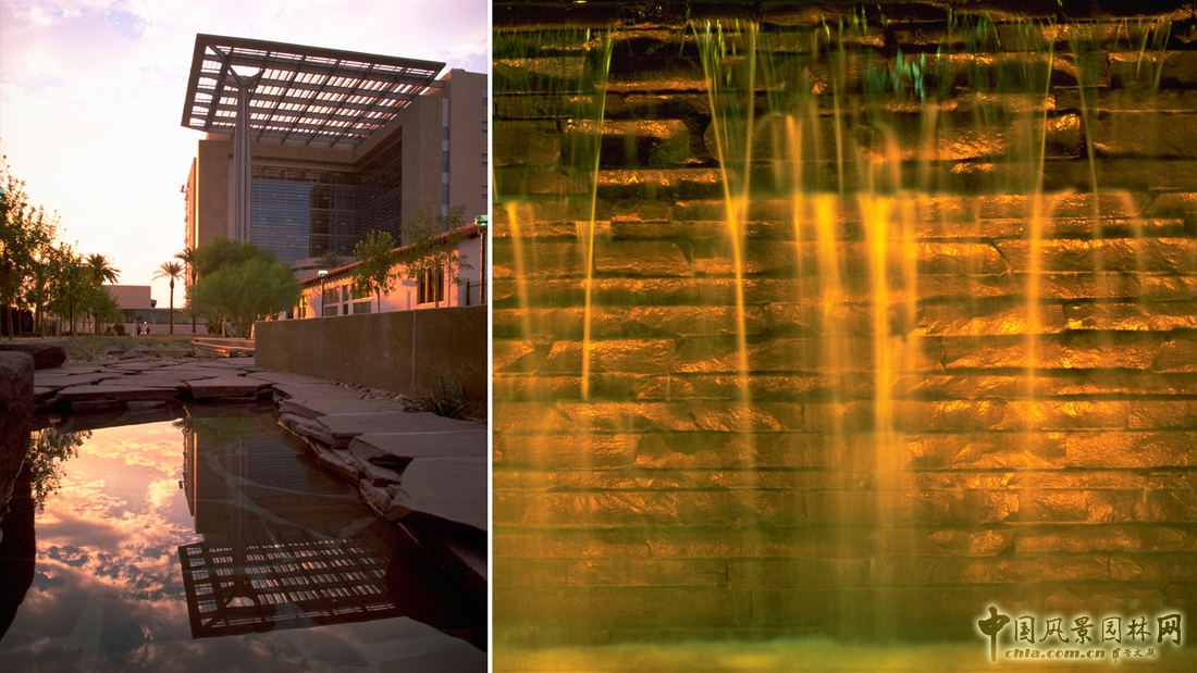 樹木和水可以用來創造一個城市綠洲,吸引眾多商業工作者、法官、律師和居住在附近的人們。兩側的兩列白蠟樹在街道上方形成一個巨大的華蓋,使走廊形成一個親切和舒適的行人空間。樹木也被用來裝飾主要的建筑物,例如司法中心周圍的棕櫚樹叢。為了結合沙漠氣候的特征,設計采用了少水和節儉的理念。利用地形東西斜坡的優勢,引附近法院噴泉里邊的水以及城市中雨水流入。同時,廣場內嵌入許多不規則的渠道用來減少突如其來的暴雨對土地的沖刷。