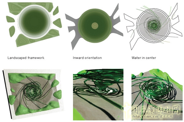 左:景觀框架  中:向內的景觀  右:中央的水渦 (平面圖及效果圖)