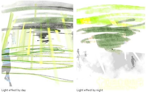 在白天,日光穿過透明的管道,折射出一道獨特的綠色情調。經管道過濾出的光線射入中央的水池中,頓時水光瀲滟。