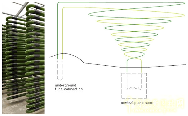 管道中的水藻營(yíng)養(yǎng)液隨著壓縮空氣的流入而不斷流動(dòng)著,保證了管道中物質(zhì)的最優(yōu)平衡,同時(shí)也避免了藻類顆粒附著在管壁上。整個(gè)循環(huán)系統(tǒng)的運(yùn)作起始于花園中央埋于地下的泵房,將泵房埋于深處可實(shí)現(xiàn)對(duì)管道中液壓梯度的充分利用。