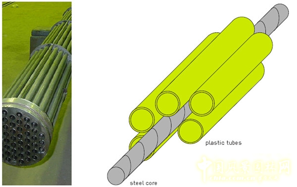 管束的結構類似于電纜束,五根直徑4厘米的塑料管固定于一根直徑3厘米的鋼芯周圍,進而構成了一個大管道。硬質的鋼芯可延展至多樣的彎曲半徑,同時將周圍的塑料管塑造成任何理想的形態。此外,鋼芯也承擔起了所有塑料管的重量,確保了整個結構的穩定性。