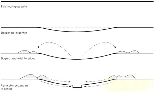 花園的中央設計了一個直徑35米、深1.7米的圓形凹陷,景觀則分布于凹陷四周及底部。而挖掘圓形凹陷所產生的沙石泥土等則被重新利用到了花園周圍造型溫和的小山丘的搭建。此外,凹陷最深處的水池可收集雨水并將其循環利用于管道之中。