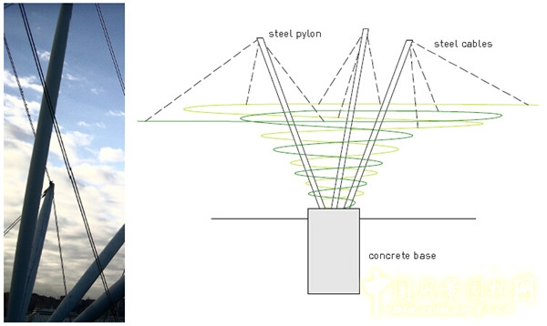 中央的基柱與三根鋼塔通過幾乎隱形的軟鋼絲支撐起了所有的塑料管道。